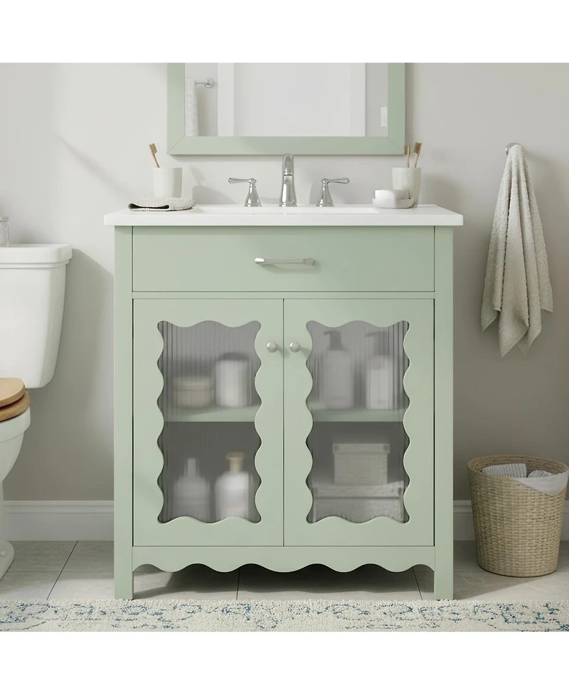 Transform your bathroom with this thoughtfully designed 31-inch vanity, perfect for maximizing style and function in compact spaces. The integrated rectangular ceramic sink offers a smooth, durable surface that resists stains and scratches, while the deep basin provides ample room for daily routines. Elegant curved lines soften the overall look, creating a welcoming atmosphere for any modern or transitional space.Vertical striped tempered glass doors add visual interest and privacy, subtly concealing stored items while reflecting ambient light to brighten your bathroom. Behind the soft-close doors, adjustable shelves offer versatile storage for towels and toiletries, keeping essentials organized and within reach. A faux drawer panel enhances the polished design and hides plumbing for a seamless appearance.With sturdy rubber wood legs and a space-saving profile, this vanity brings lasting quality and charm to your home. Overall dimensions: 31"W x 18.8"D x 34.25"H.