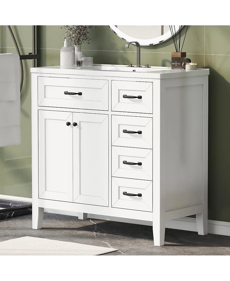 Elevate your bathroom with this beautifully crafted 36" vanity, designed to bring both style and organization to your space. The smooth ceramic sink resists stains and is easy to clean, making daily routines effortless. Built with a solid wood frame and durable Mdf board, this vanity offers lasting stability and a modern touch. Ample storage is provided by a spacious cabinet and three handy drawers—perfect for keeping towels, toiletries, and essentials neatly tucked away. Decorative grooves add an elegant accent, while the water-resistant finish ensures the vanity stands up to daily moisture. With thoughtful details and quality materials, this freestanding piece is perfect for any contemporary bathroom upgrade.Dimensions: 36.02"W × 18.31"D × 35.7"H.
