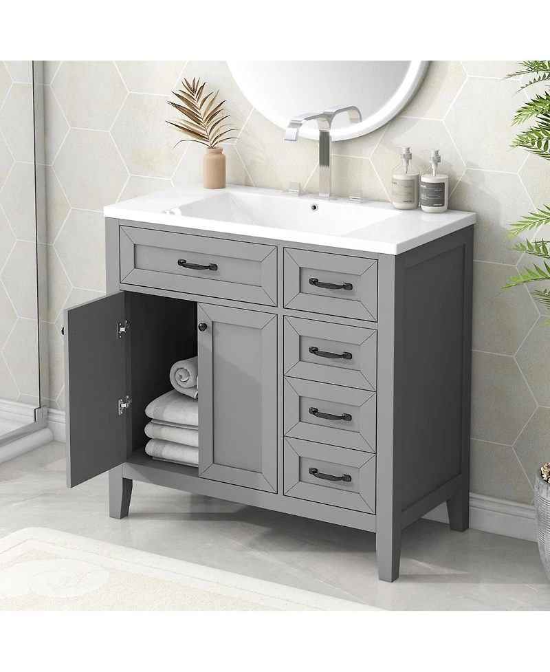 Refresh your bathroom with this stylish 36" vanity, crafted for both beauty and durability. The smooth ceramic sink resists stains and is easy to clean, providing a fresh and polished look every day. A solid wood frame and sturdy Mdf panels ensure lasting strength, while the freestanding design brings a modern touch to any space. Ample enclosed storage includes a spacious cabinet and three functional drawers, ideal for keeping towels, toiletries, and daily essentials neatly organized and dust-free. Decorative grooves on the doors and drawers add a refined accent, making this vanity as elegant as it is practical. With a water-resistant finish and thoughtful construction, this vanity is designed to withstand daily use and elevate your home with dependable style.Dimensions: 35.98"W × 18.03"D × 35.98"H.