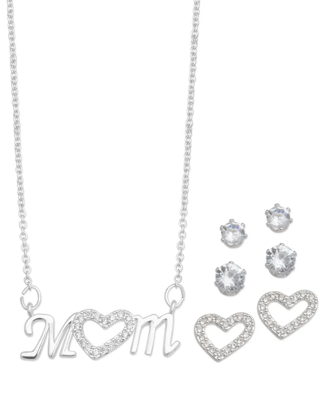 Silver Plated Cubic Zirconia Pave Mom Heart Necklace with Three Piece Earring Set