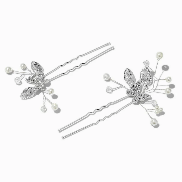 Silver-tone Crystal Butterfly & Pearl Spray Hair Pins - 2 Pack