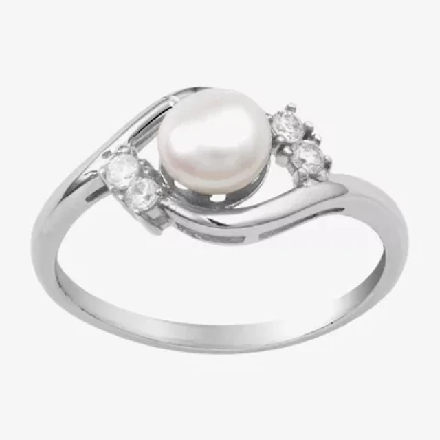 Silver Treasures Cultured Freshwater Pearl Womens White Cubic Zirconia Sterling Delicate Bypass Promise Ring