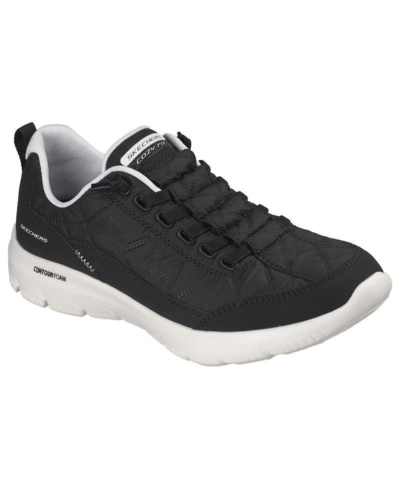 Carefree comfort and easygoing style find common ground on these Skechers Women's Summits Contour Foam Cozy Fit Athletic Walking Sneakers. Crafted with a Cozy Fit Quilted mesh, leather, and upper, this slip-on is equipped with an Air-Cooled Memory Foam insole and an ultralight Contour Foam midsole No Tie Fit design that keeps you peacefully on pace.