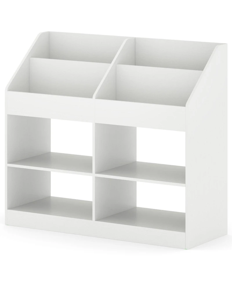 Keep your child s room tidy and organized with this 3-tier kids bookshelf and toy storage organizer, designed for both functionality and easy access. The three spacious shelves provide room for books, toys, and decorative items, while the four compartments offer additional storage for bins, puzzles, or smaller belongings. A built-in display rack highlights favorite books or collectibles, encouraging reading and creative play. Crafted with a sturdy frame for stability and everyday use, this organizer helps teach kids organization while keeping essentials within reach. Its compact design and playful functionality make it ideal for bedrooms, playrooms, or classrooms.