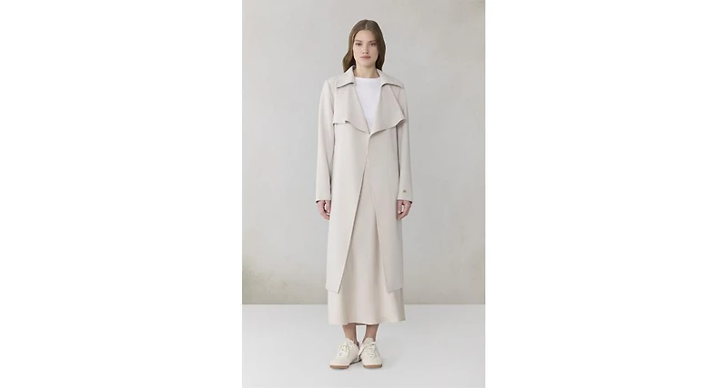 The Dimitra by Soia and Kyo is a classic trench reimagined with a striking shirt collar and cascading storm flaps. Wear it open with a cool confidence or tie it closed to weather the storm. Finished with side slits and angled welt pockets.