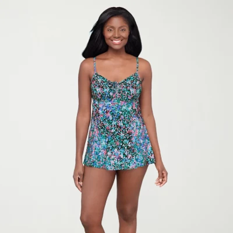 This Sonnet Shores women's swim dress is an eye-catching number that also gives you greater coverage. Made from smooth stretch-jersey in a multicolor dot-print, this sleeveless short dress has spaghetti straps and a flowy skirt.