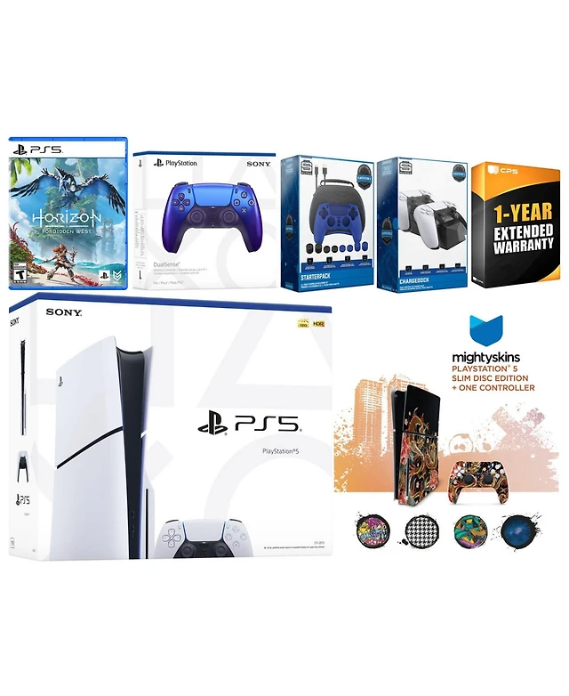 Sony Playstation 5 Slim Disc with Horizon Forbidden West, Extra Volcanic Red Controller, Gamer Kit, Charge Dock and MightySkins Decal Voucher + 1 Year