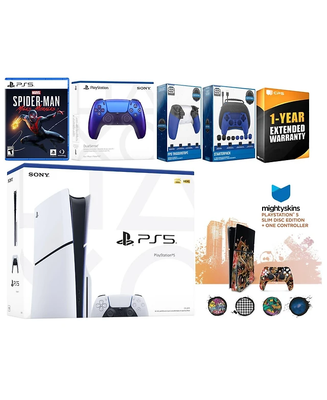 Sony Playstation 5 Slim Disc with Spider-Man: Miles Morales, Extra Sterling Silver Controller, Gamer Kit, Trigger Kit and MightySkins Decal Voucher +