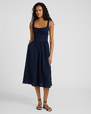 Square Neck Sleeveless Tie Front Drop Waist Midi Dress