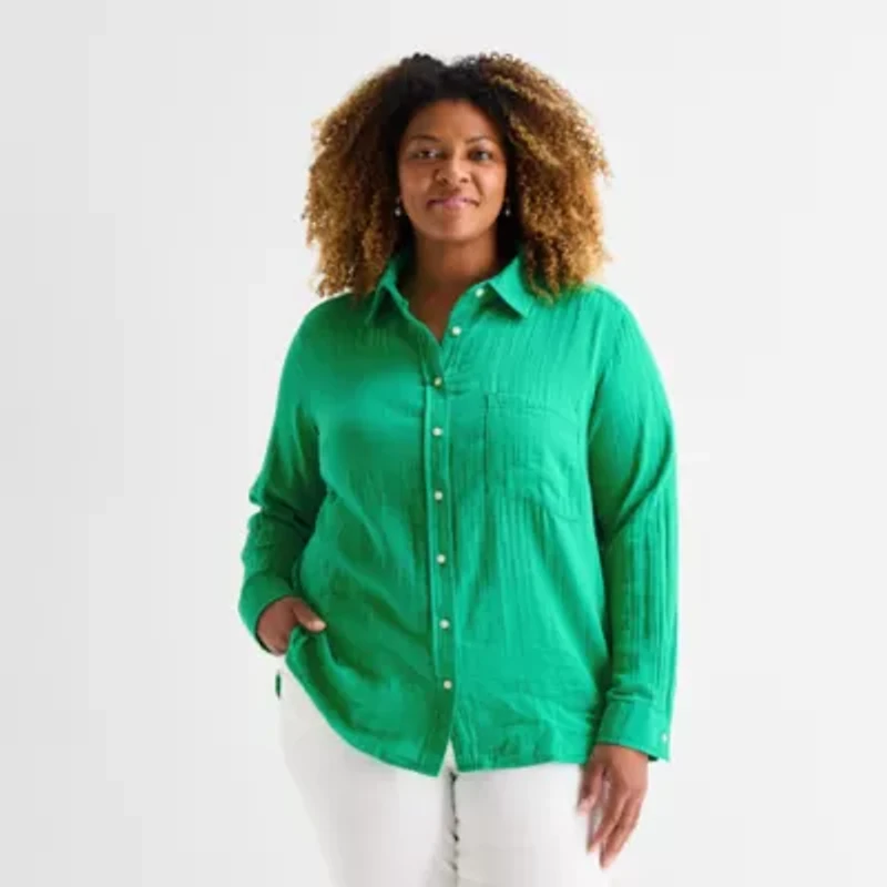 St. John's Bay Womens Plus Long Sleeve Relaxed Fit Button-Down Shirt