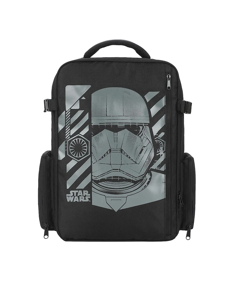 Embark on your journey to a galaxy far, far away with this black Star Wars large travel backpack. Featuring a grayscale stormtrooper image on a diagonal stripe background, this 17” backpack blends style and functionality seamlessly.
