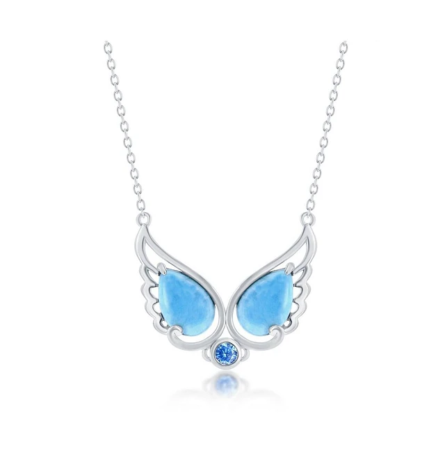 Sterling Silver Double Larimar Angel Wings w/ Round Aqua Cz Necklace