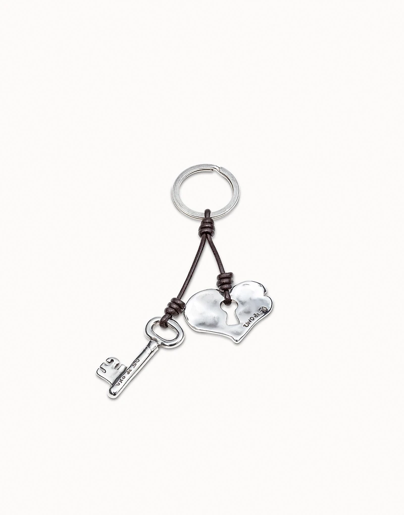 Brown leather keychain with heart and key bead. Iconic of UNOde50, 100% handmade in Spain.