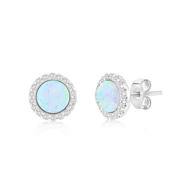 Sterling Silver White Synthetic Opal Round Halo, Cz Border Earrings