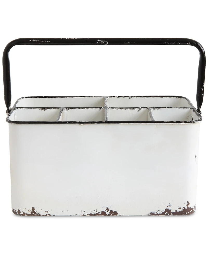 Organize any space with style and flair with this distressed white and black metal caddy with six compartments and handles. This rustic and charming metal caddy features six rectangular compartments holding various items, such as utensils, napkins, condiments, craft supplies, or plants. The caddy also has a sturdy metal handle that makes it easy to carry and move around. The metal caddy has a distressed white and black enamel finish that gives it an aged and worn look. This piece is perfect for a style of farmhouse, country, or vintage home decor. This caddy can be placed on the kitchen counter, dining table, desk, or shelf for a touch of personality and organization. The caddy measures 11 inches long, 6.25 inches wide, and 9 inches high. Order this today and enjoy a stylish and practical addition to any home.