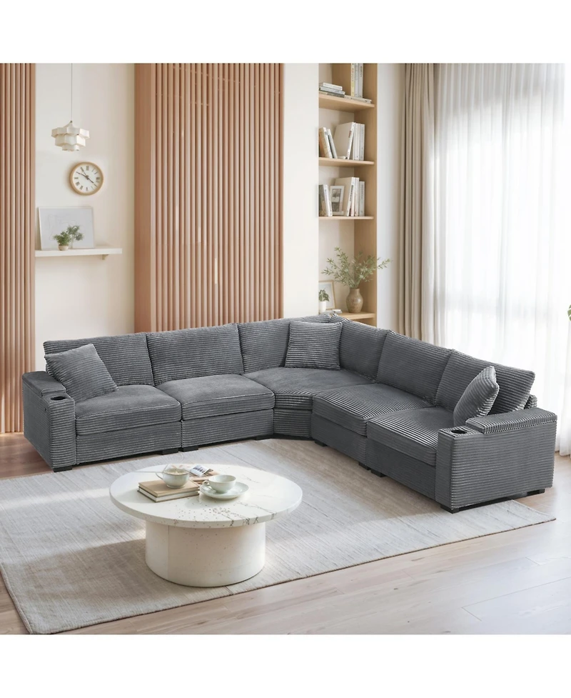 Corduroy L-shaped sofa with hidden armrest storage, Usb charging, and cupholders. Modular design for flexible arrangement. Pillows included!