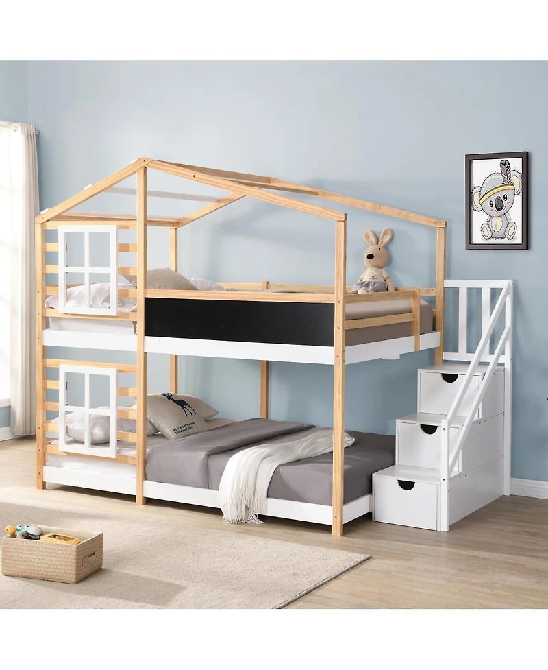 Streamdale Furniture Full over Full Bunk Bed House Bed with Roof, Windows, Blackboard, Storage Ladder