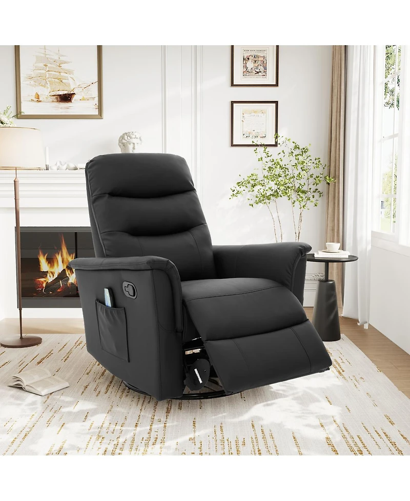 Relax in comfort with this black Pu manual recliner. Features 2 reclining angles, 8-point massage, 270° swivel, gentle rocking, and a side pocket. Easy assembly.
