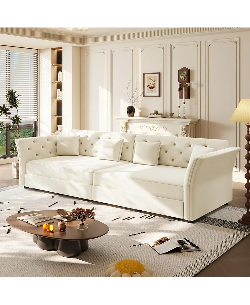 Experience luxurious comfort with this 100" velvet sofa. Featuring artistic floral tufting, deep seating, and included pillows, it's built to last with a wood and iron frame. Converts to a bed. Assembly required.
