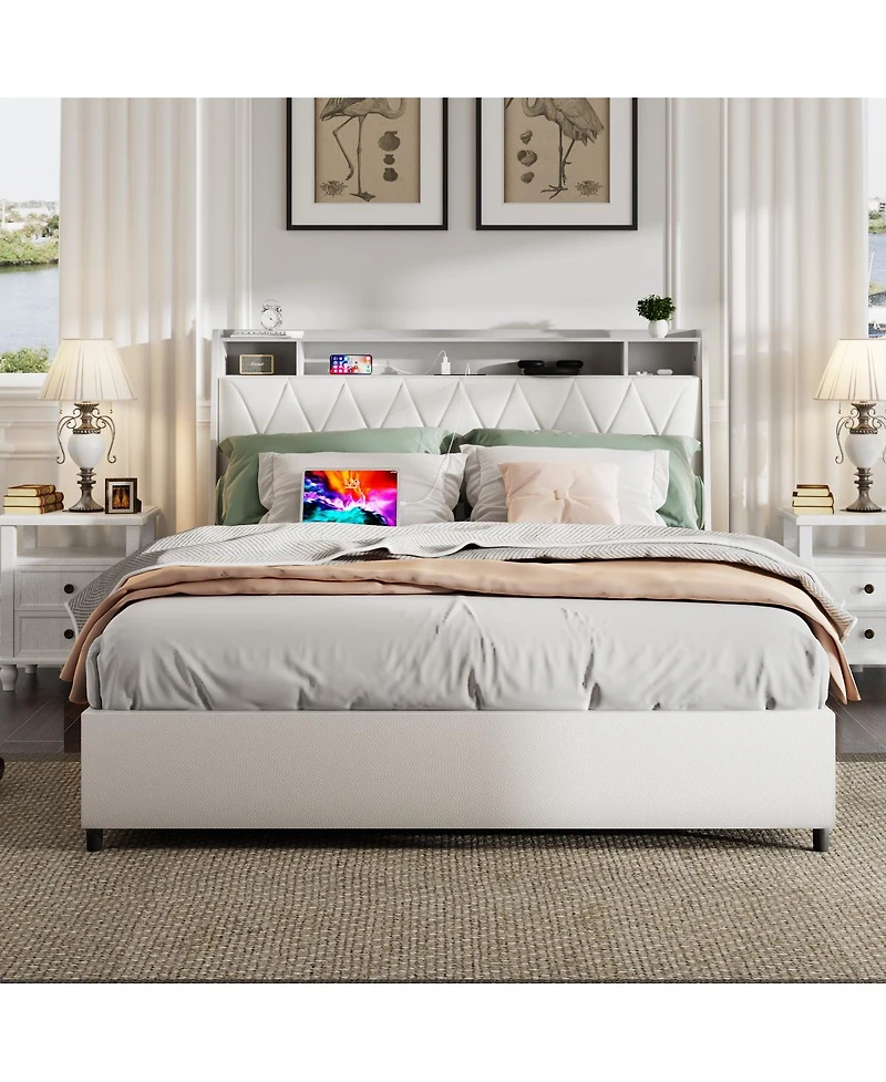 Streamdale Furniture Queen Bed Frame with Ergonomic Headboard, Outlets & Storage Shelf
