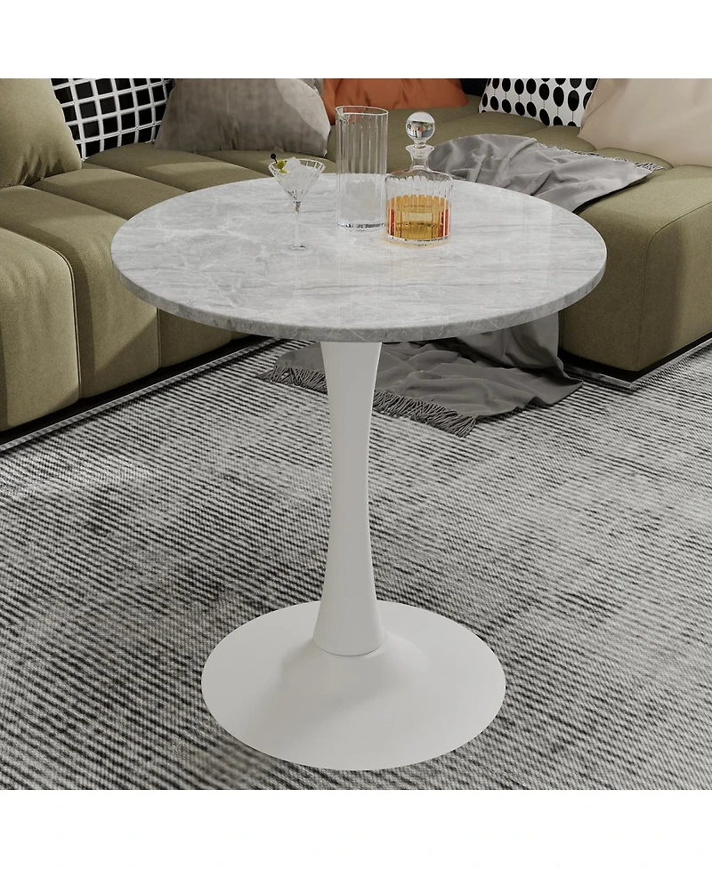 Elegant round side table with marble-look top and white pedestal base. Perfect for drinks, books, or plants. Modern minimalist design enhances any living space. 27.56" W x 27.56" D x 28.35" H.