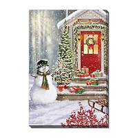 A smiling snowman welcomes visitors to a festively decorated home with wrapped presents and a glowing tree, creating a sense of invitation and warmth. Homeowners will love this for its bright, cheerful energy and classic Christmas atmosphere.