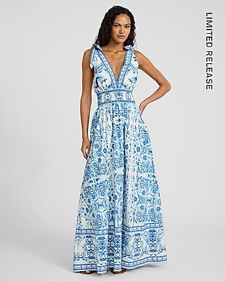 Printed V-Neck Tie Shoulder Maxi Dress