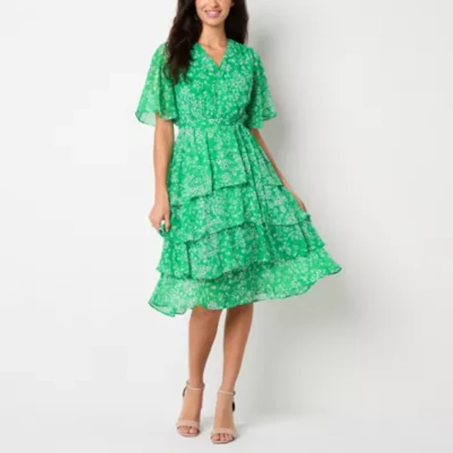 Studio 1 Womens Short Sleeve Floral Midi Petite Fit + Flare Dress