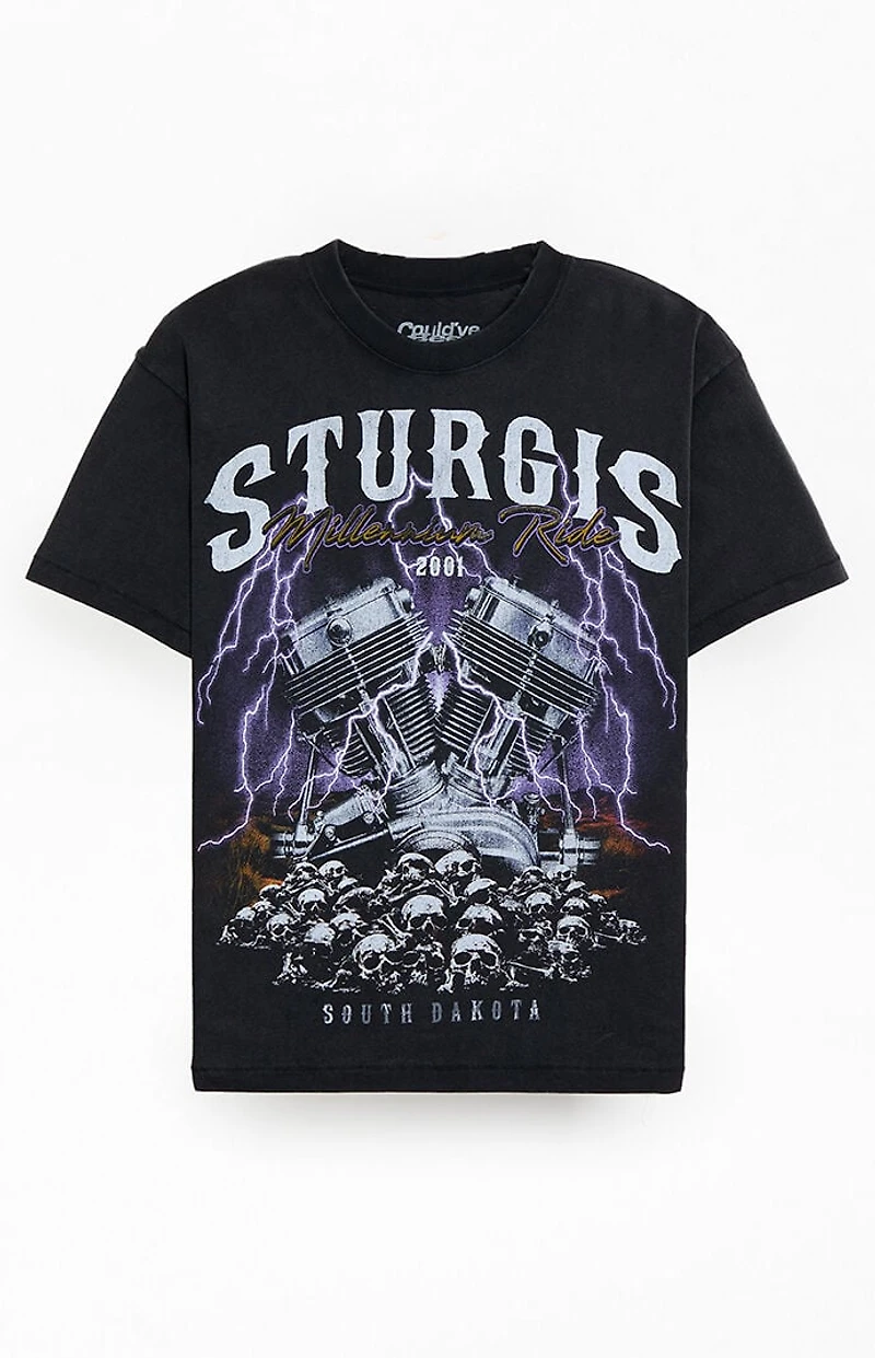 Pay tribute to the iconic motorcycle rally with the Sturgis Millenium Ride 2001 T-Shirt. Crafted with vintage wash fabric, this casual tee boasts short sleeves, a crew neckline, and front and back graphics.