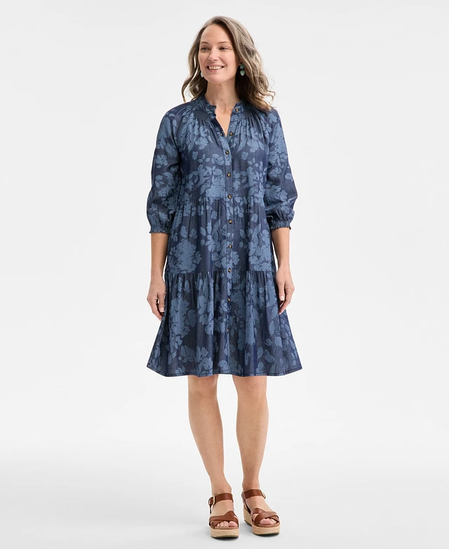 Style & Co Women's Floral Chambray 3/4-Sleeve Tiered Dress, Exclusively at Macy's