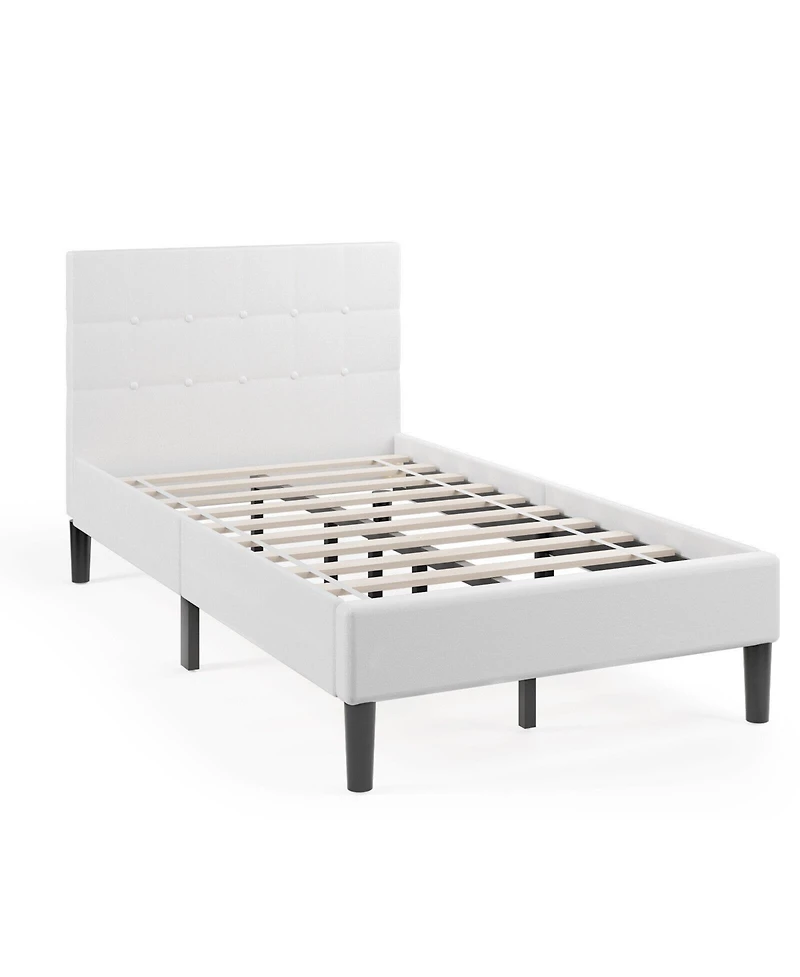 Add a polished look to your bedroom with this twin upholstered bed frame featuring a button-tufted headboard and a supportive slat platform base. The padded headboard is filled with sponge and wrapped in fabric for a comfortable backrest when reading or relaxing in bed. A reinforced frame combines a metal structure with bentwood slats and multiple support legs, including added center legs, to help improve stability for everyday use. The platform design supports a twin mattress directly without the need for a box spring, while the under-bed clearance offers space for storing shoes or bins to keep the room more organized. Designed with straightforward assembly in mind, this bed frame includes the necessary parts and instructions for setup.
