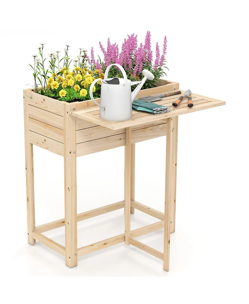 Make everyday gardening more convenient with this wooden raised garden bed designed with an elevated planter box and a foldable side table. Crafted from fir wood with a natural finish, it brings warm, rustic style to patios, balconies, and small yards while keeping planting and tools organized in one compact station. The slatted bottom includes drainage gaps to help reduce water buildup and support airflow through the planter. A fold-down side table adds handy surface space for tools, pots, or gloves, then folds away when you want a smaller footprint. Standing 29.5 inches tall, the raised design keeps plants within easy reach for routine care. With a natural surface that can be painted or stained, this planter is easy to customize to match your outdoor decor.
