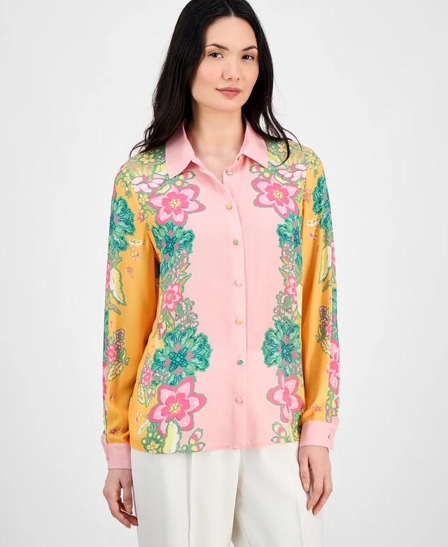 T Tahari Women's Printed Button-Front Long-Sleeve Shirt