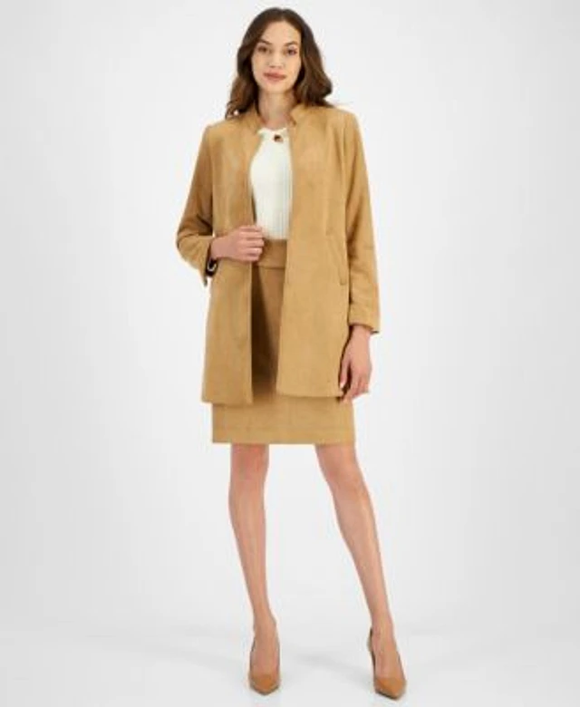 Tahari Asl Womens Faux Suede Stand Collar Jacket Twisted Keyhole Long Sleeve Ribbed Knit Top Faux Suede Pencil Skirt