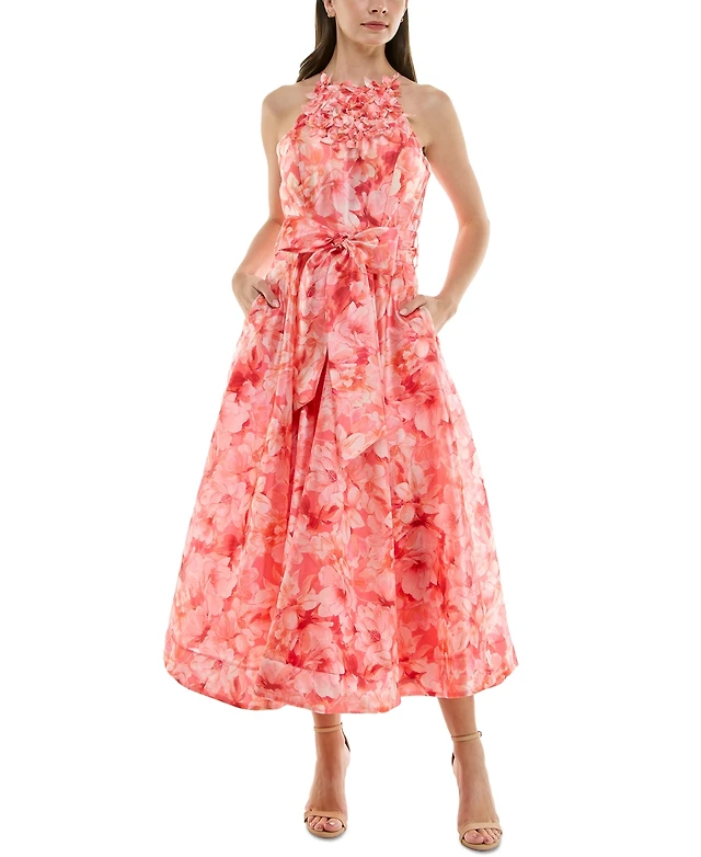 Taylor Women's Floral-Trim Bow-Waist Midi Dress