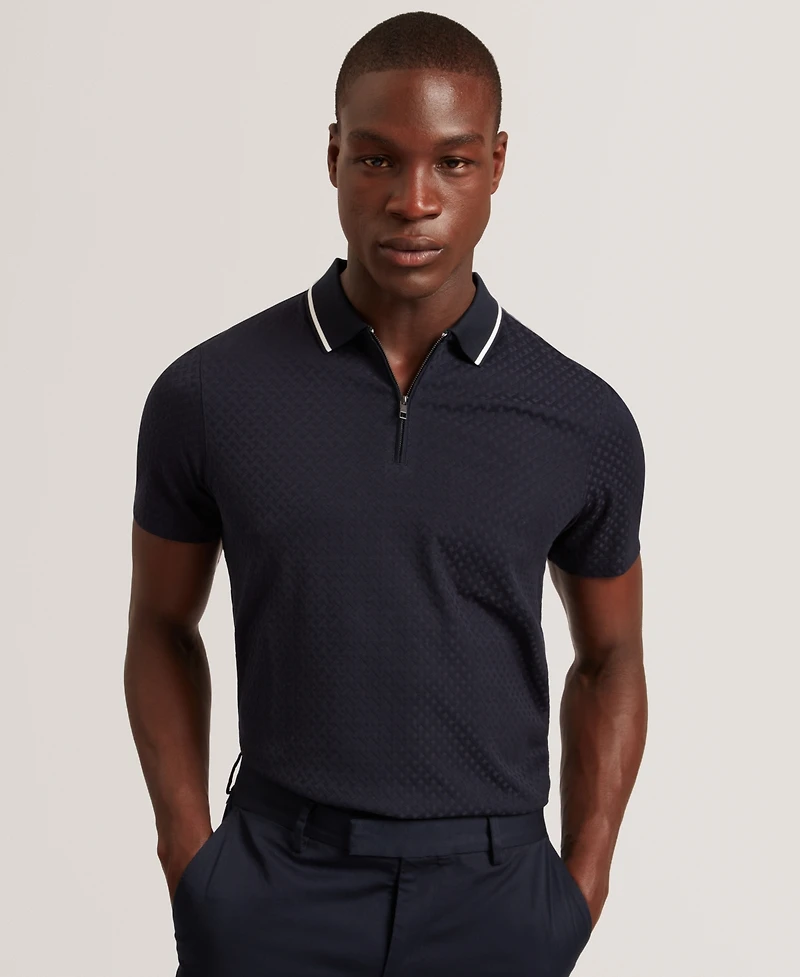 Highlighting a branded T-texture, this Ted Baker polo shirt is crafted with stretch for easy movement. The zipped neckline and stripe trim collar offer a modern twist on a classic design.
