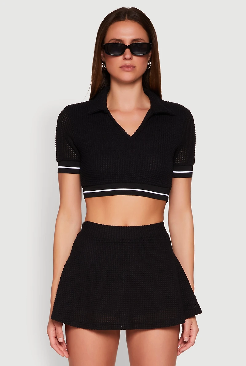 Upgrade your casual game with our Textured Knit Johnny Collar Crop Top. Designed for comfort and style, this classic fit polo shirt features a textured knit fabric that adds a touch of sophistication to your everyday look. The contrast trim detail makes it pop, while the cropped hem and elastic hem ensure a perfect fit that moves with you. Whether you're hitting the gym or hanging out with friends, this versatile top is your new go-to for effortless style.
