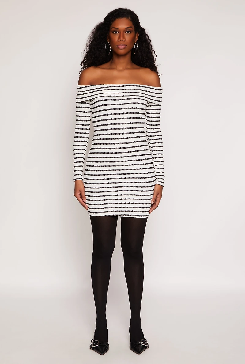 Textured Knit Striped Off The Shoulder Dress