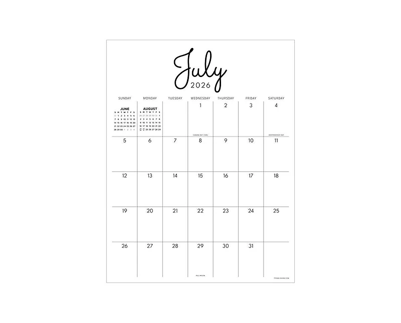 Simplistic, script typography and bold, black numerals are the stars of this 12-month, academic year art calendar and is perfect for office or home. This large, 17" (w) x 22" (h), portrait-oriented, calendar has expansive calendar grids with ample space for daily appointments, tasks and to-dos, plus a reference of the previous and upcoming months. Monthly, tear-off sheets are made of premium, art paper for easy writing and erasing as plans often change. This calendar spans July 2026 - June 2027 and can either lay flat or be hung on the wall by the drilled holes. Boxes measure 2.3" (w) x 3.2" (h).