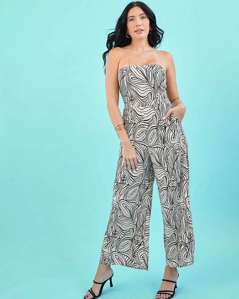 This patterned design features a tube top appeal with a black and white color scheme. Classic and accentuating in all the right places, this long pants jumpsuit is a must.