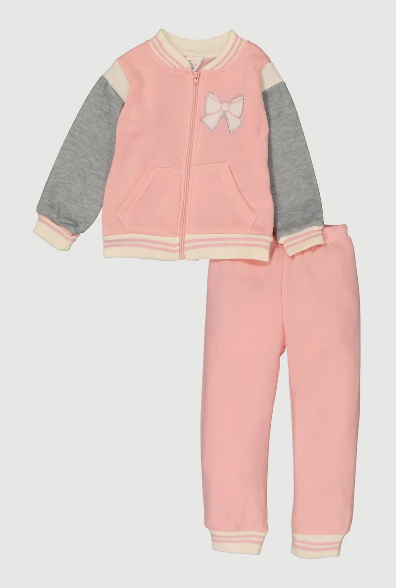 Get your little one ready for fun and style with this Toddler Girls New York Back Graphic Jacket and Sweatpants set. Featuring a trendy varsity jacket with a bold New York graphic on the back and an adorable bow graphic on the front, this 2-piece outfit blends comfort and cool effortlessly. Made from cozy fleece, the set is perfect for casual days and back-to-school looks, keeping your toddler warm and stylish. The tapered sweatpants with a mid-rise fit complete the athleisure vibe that’s both playful and practical.