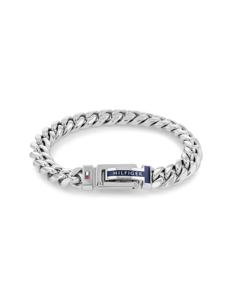 Tommy Hilfiger men's jewelry. Presenting our chain bracelet- rendered in stainless steel and featuring the iconic micro flag logo at the closure.