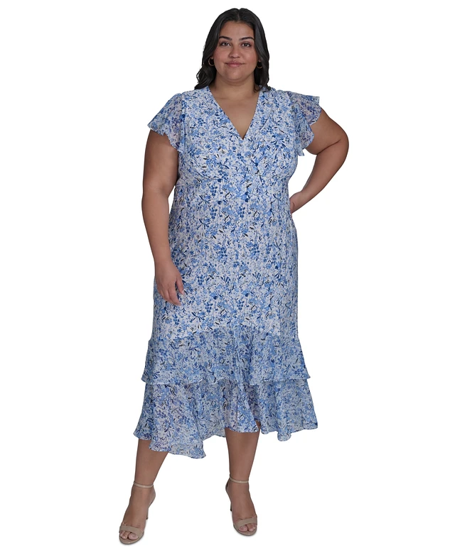 Tommy Hilfiger Plus Size Floral Print Chiffon Flutter-Sleeve Midi Dress