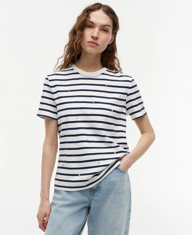 Add a subtle sparkle to your everyday wardrobe with this Tommy Hilfiger crewneck T-shirt, featuring a chic bling logo detail. Crafted from soft, breathable cotton, its flattering fit, ribbed texture, and short-sleeve deliver effortless comfort with signature style.