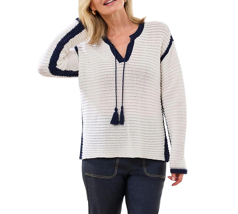 Notch collar styling and tassel accents give this long-sleeve cotton sweater an elevated, playful edge. Crafted from soft combed cotton, the relaxed-fit and lightweight feel make it perfect for spring days, layering, or casual resort looks.