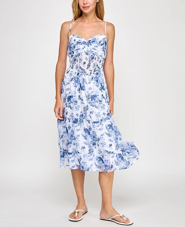 Trixxi Juniors' Printed Sweetheart Slit Puff-Sleeve Midi Dress