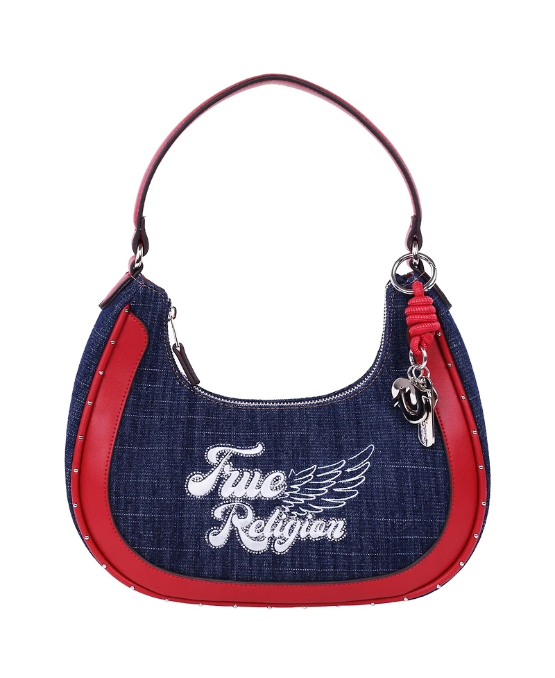 True Religion Wing Motif Denim Hobo Bag with Red Trim