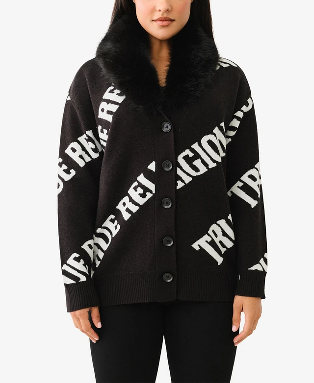 True Religion Women's Faux Fur Collar Cardigan Sweater