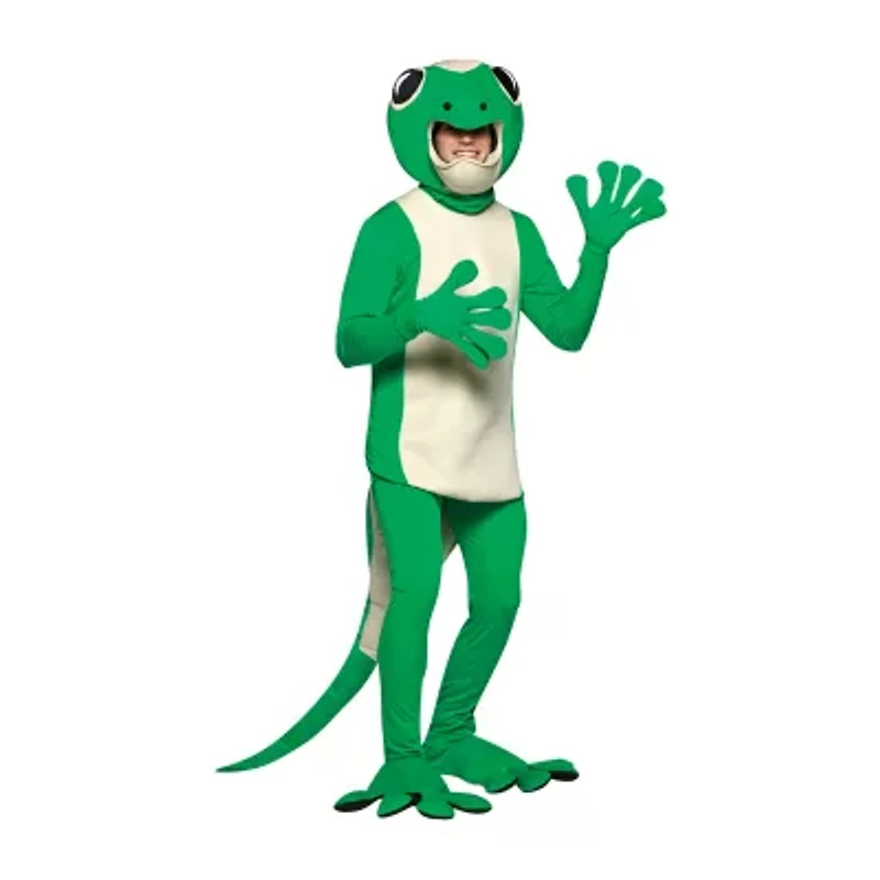 Gecko adult costume. Now you can give advice on insurance or attend a jungle themed dinner party. Includes: headpiece that slips over the head with gecko's mouth as opening for the face, shirt with tail, green pants with elastic waist band and reptilian gloves and shoe covers. Available size: one size fits most adults.