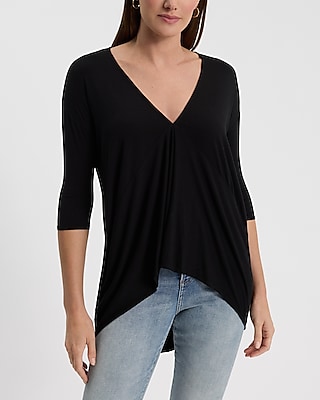 V-Neck Elbow Sleeve Draped Front Hi Lo Tee